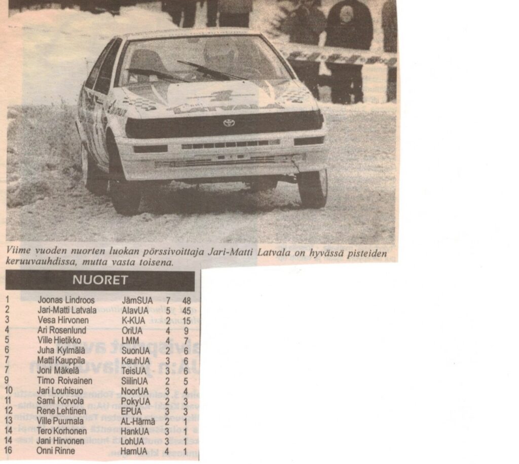 “In youngsters’ group Joonas Lindroos was driving with VW Golf with maximum attack in the first pass. He’s time was almost seven seconds faster than Jari-Matti Latvala. Latvala’s bad time was caused by situation when he reached driver who started to the stage before him, and he wasn’t able to pass him at the narrow road. Latvala started second pass as a contender. Now Corolla was moving with the style that had been seen before, impressively and fast from start to finish, and he improved his time by 7,2 seconds. Lindroos wasn’t able to improve his time, so Latvala took the victory again.”
