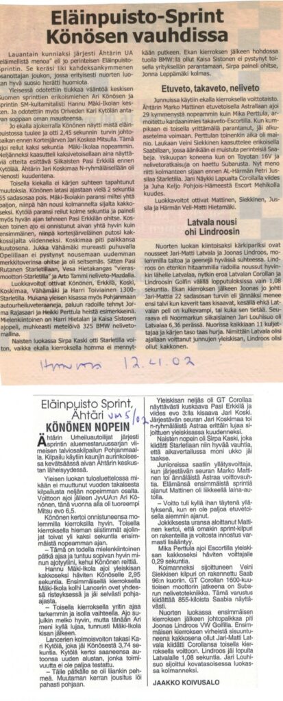 “Jari-Matti Latvala continued his convincing winning streak also in Eläinpuisto sprint at the youngsters’ group. At the second pass times were better, because there weren’t so many yellow warning flags than in the first pass. Jari-Matti Latvala’s time 2.19,88 was over second faster than Lindroos.”