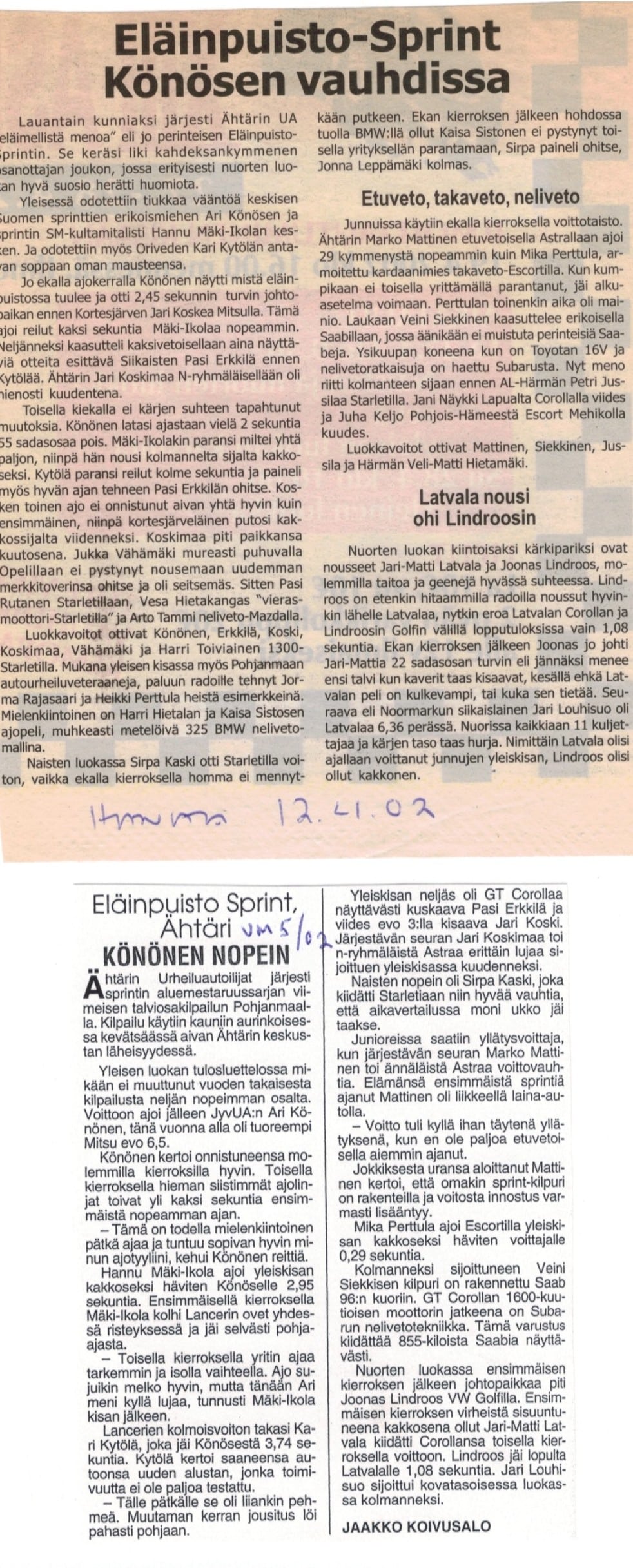 “Jari-Matti Latvala continued his convincing winning streak also in Eläinpuisto sprint at the youngsters’ group. At the second pass times were better, because there weren’t so many yellow warning flags than in the first pass. Jari-Matti Latvala’s time 2.19,88 was over second faster than Lindroos.”