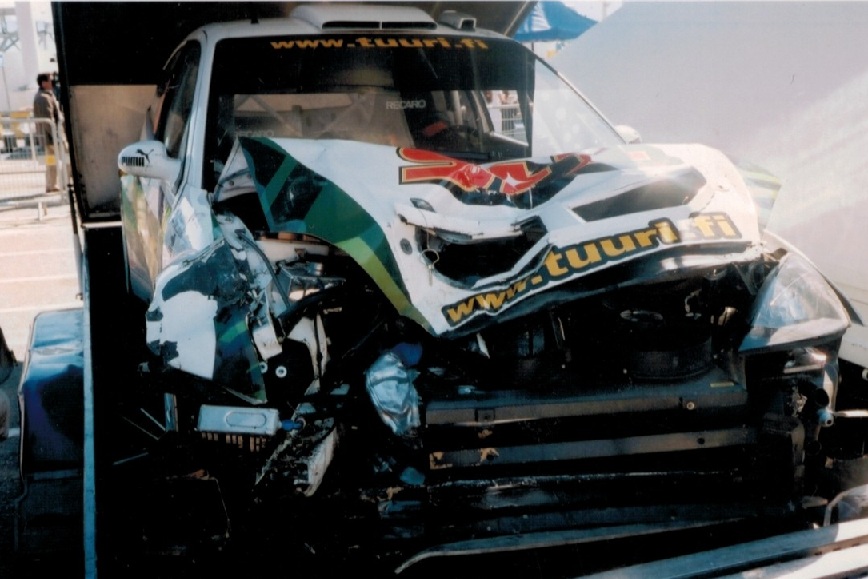 The first stage went very well on Saturday morning. We lost only 0,5 seconds per kilometre to Loeb who was the fastest on that stage. We made a fatal error on stage six. The microphone of Miikka´s helmet jumped up and I only heard a part of the notes. I was stupid and didn´t understand to slow down. When I heard the rest of the notes I started to brake, but there was sand on the road and the car slid. I tried to get a grip but there were rocks in the inner curve and they hit the steering so hard that I broke my thumb. The car rose on two wheels, I lost control and we hit the trees.