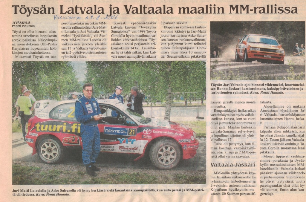 Neste Rally 2006 was driven with our own sponsorships from mainly Tuuri but also other regions of Finland. So we collected budget by ourselves and Asko Sairanen was my co-driver at this event. This is the only event that I have driven with Asko in WRC level. Our target was to pass the rally and get experience for the future. At the very first special stage we had some disagreements because of spin, but after that we got right mood. We tried our best and we were competing even for the 8th place, but we had also some technical difficulties. Tyre exploded at Ouninpohja and it got fired. We need to stop and extinguish the fire, it was quite close that whole car got burned. We managed to change the tyre but it took 3-4 minutes. We were dropped at the scoreboard quite a lot. After that we got oil leakage at the gear box and it caused another fire, but we managed with that. I don’t remember all the other difficulties but after all those we reached the finish at the 17th place. We got fighting spirit trophy. We decided to finish the rally, and so we did.