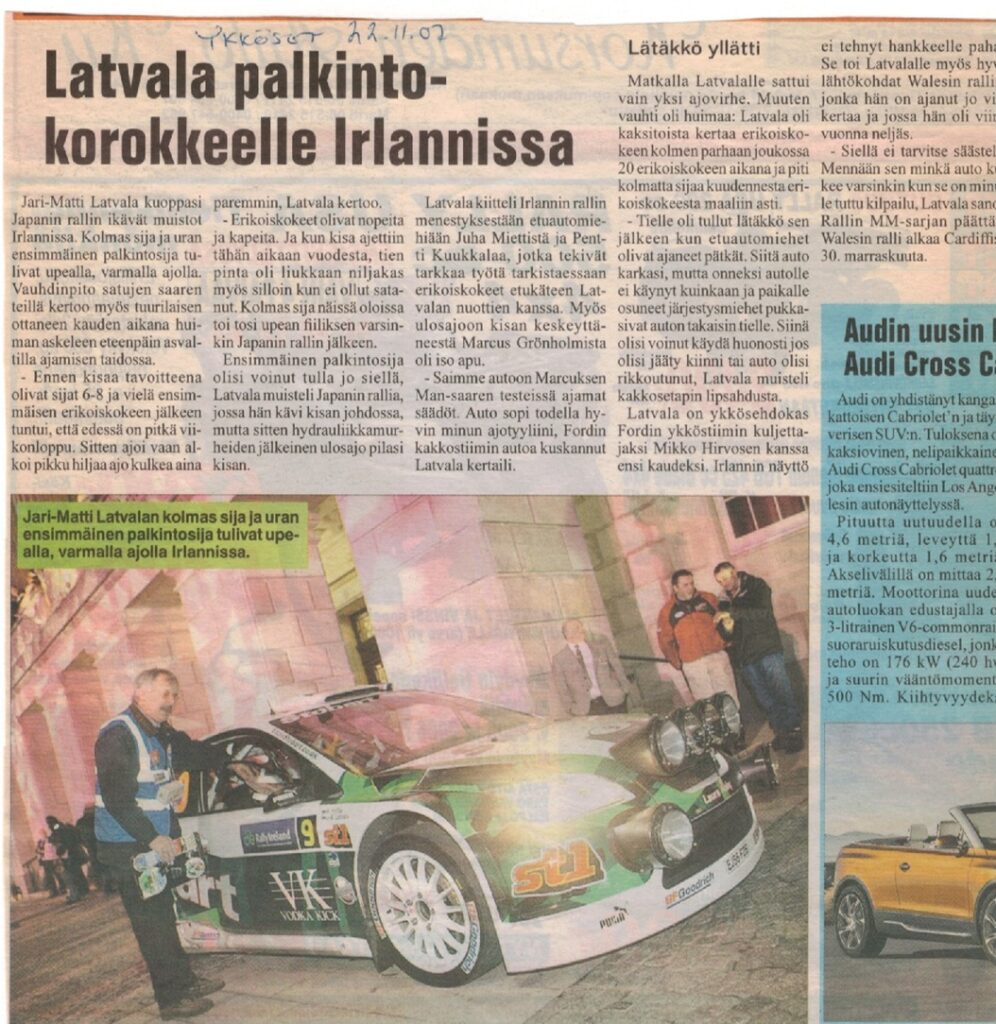 The rally started on Thursday evening with a super special which was driven in Belfast. The racing cars were taken there by trucks because Belfast is situated 200 kilometres from the rally centre, Sligo. The super special was driven in a park in front of the parliament building. My race started well because I was sixth after the first stage. The actual rally started on Friday morning with 166 kilometres of narrow, slippery and fast tarmac roads ahead. I was a bit exited before the rally because I was wondering how slippery the roads would really be. After the first stage I thought that this is going to be a really long and difficult rally because of all the mud on the roads. I started to trust the car and my driving more and more during the morning stages and due to the right tire choices it for easier for me to drive, but definitely not easy as such at all. I drove the whole Friday without any mistakes and to my surprise I was third at the end of the day. Not even the fast and bumpy stage 8 could weaken my position. On Saturday the stages were driven in Northern Ireland where we drove 104 kilometres. I was the second fastest on all the three morning stages. In the afternoon we drove the same stages again and I made one mistake. On stage 14 which was the afternoon’s first stage I drove into a rut of water in a left corner. The car started to push and I had to use the handbrake which made the car slide and hit a fence sideways. Luckily the car was not damaged but we got stuck in the mud. Fortunately there were spectators who helped us back to the road. The good thing was that we only lost 30 seconds. On the next stages my pace was normal again and we finished the day in third position. On Sunday there were 56 kilometres waiting for us. My aim was to drive calmly and to maintain my position. I didn’t hurry too much on the morning’s first two stages which brought Mikko Hirvonen closer, he was now only 15,6 seconds behind us. On the next stage I beat Mikko with 12,2 seconds. He was 28 seconds behind us before the last stage which we did well and we finished the rally in third position and were able to get to the podium for the first time. It felt extremely good!