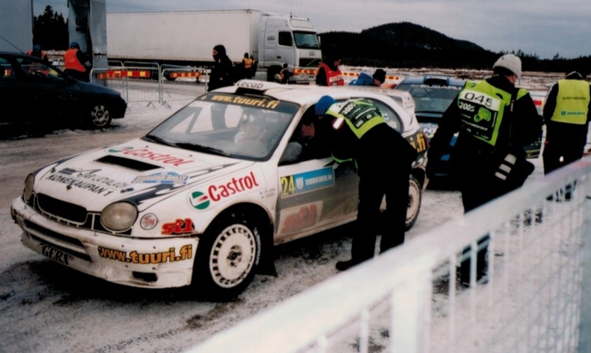 With steady drive rally started well, until on SS3 I hit a stone when I followed the lines of ”the big boys”. Schock absorber broke and rim went to pieces. I had to change the tyre. Changing did not go as planned because jack fell down. Finally we spend time 5,5 minutes. At finish we were comforted with the knowledge that six other WRC drivers had hit to the same stone. The rest of Friday and Saturday we drove steadily, but yet to get good stage times. We got some slow times too on the last stage before service because studs always came off.