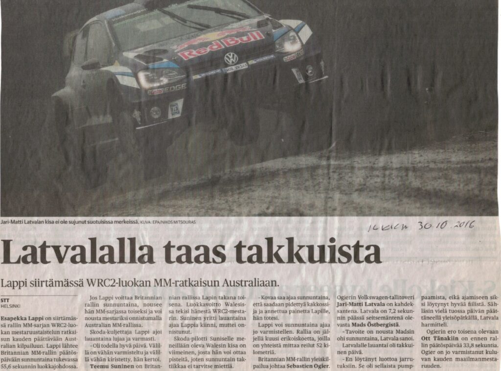 Walesin mutaisen liukkaat metsätiet ovat Jari-Matti Latvalalle liki yhtä tuttuja ja mieluisia kilpa-areenoita, kuin keskisen Suomen soratiet. Tänä vuonna onnetar ei kuitenkaan hypännyt kyytiin, kun Latvala nosti kytkintä. Hän juhli Walesissa Volkswagenin automerkkien mestaruutta tiimikavereidensa Sebastien Ogierin ja Andreas Mikkelsenin kanssa, mutta ei palkintokorokkeella. Hän ajoi maaliin seitsemäntenä. Latvalan podium-haaveet särkyivät, kun vetoakseli petti rallin avausetapin viimeistä edellisellä pikataipaleella, kovavauhtisessa mutkassa. Tuolloin Latvala oli rallissa kolmantena.