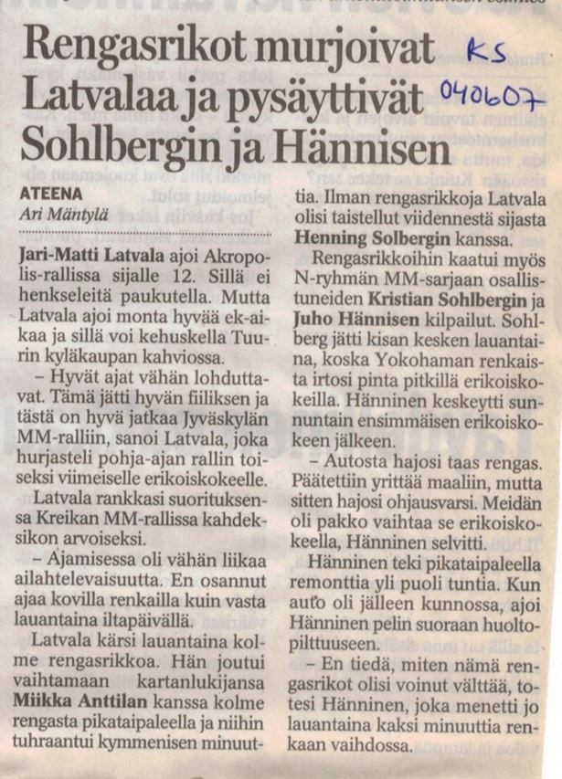 Kreikan MM-Ralli on aina haastava kilpailu ja sitä se oli myös tänäkin vuonna, vaikka tiet olivat edellis vuotta paremmassa kunnossa. Ralli alkoi kohtuu hyvin, sillä olimme kahden ajetun ek:n jälkeen yleiskilpailussa viidentenä. Valitettavasti jo ek:lla kolme pyörähdin rajusti ja menetin siinä yli 20 sekuntia. Sen jälkeen tuli tilanteita vähän väliä, mutta kuin ihmeen kaupalla pysyimme tiellä. Onneksi luottamus palautui perjantai-iltana. Olimme perjantain jälkeen tuloksissa kahdeksantena. Lauantaista tulikin sitten todella hankala päivä. Aamun ensimmäinen “pätkä” oli 48 km pitkä ja meillä meni ek:n puolessa välissä rengas puhki, jonka vaihdoimme kartturi Miikkan kanssa kolmessa minuutissa. Renkaan vaihdon jälkeen oli vielä mandollisuuksia pistesijoihin, mutta toisella kertaa pitkää “pätkää” ajettaessa nekin haihtuivat. 6km ennen ek:n maalia molemmat eturenkaat puhkesivat ja meillä oli mukana vain yksi vararengas, mikä tarkoitti sitä, että meidän oli laitettava ehjät renkaat eteen ja rikkinäinen taakse. Ajoimme sillä tavalla hiljaa ek:n maaliin ja hävisimme siinä yli 10 minuuttia.