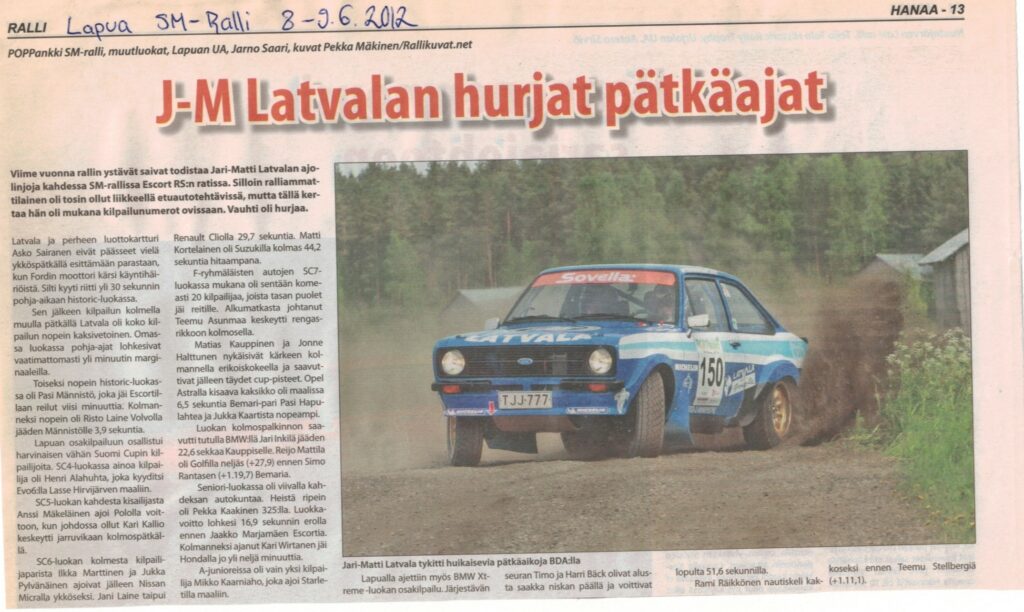 Syksyllä 2011 tukivarren rikkoutumisesta johtunut ulosajo Keravan SM-rallissa vaurioitti pahasti BDA Escorttiamme. Sen jälkeen alkoi uudelleenrakennustyö, jota kesti n. 8 kuukautta ja auto saatiin parsittua kasaan juuri ennen ennen Lapuan SM-rallia, joka oli samalla SM-sarjan ensimmäinen kesäkisa. Autoon tehtiin talven aikana muutamia parannuksia, ja kun oli taukoa MM-ralleista niin halusin lähteä kokeilemaan uudistunutta kilpuria. Pientä jännitystä oli päällä, sillä olihan ollut pitkä tauko siitä, kun olin ajanut viimeksi takavetoautoa, mutta heti ensimmäisestä mutkasta alkaen se katosi, kun moottori raikasi 9000 – kierrosta ja takapyörät ohjasivat. Ensimmäisellä erikoiskokeella oli pientä ongelmaa, kun puolivälissä ilmanputsari meni tukkoon ja kone ei saanut ilmaa. Kone kiersi vain alle 6000 rpm, ja kun vetoalue on 6000-9000 rpm, niin eteneminen oli hidasta. Hävisimme ongelman vuoksi lähes minuutin, mutta huollossa auto saatiin kuntoon. Erikoiskokeilla 2 ja 3 aloin päästä “vanhan ajan” fiilikseen ja ajaminen oli rennompaa ja nautinnollista. Ek kolmosen lopussa tempasin risteyksessä liian nopeasti käsijarrua, niin koettiin pieni pyörähdyskin. Ek 4 oli rallin viimein, mutta silti annoimme tulla kartturini Asko Sairasen kanssa vauhtia säästelemättä, vaikka vähän uraakin oli tiehen muodostunut, kun lähtöpaikkamme oli lähempänä sataa. Kisa meni erinomaisesti, sillä voitimme Historic-81 luokan, vaikka pieni ongelma olikin alussa. Uudistuneessa autossa oli parantunut vetopito sekä moottorin ajettavuusalue.