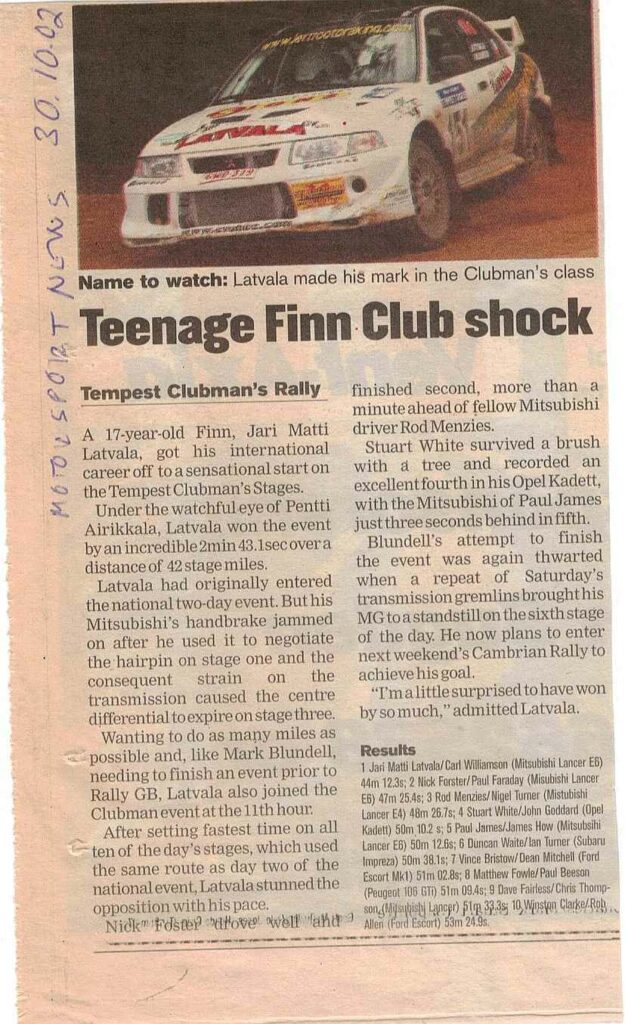 Motorsport news: ”A 17-yaers-old Finn, Jari-Matti Latvala, got his international career off to a sensational start on the Tempest Clubman’s Stages. Under the watchful eye of Pentti Airikkala, Latvala won the event by an incredible 2 min 43.1 sec over a distance of 42 stage miles.”